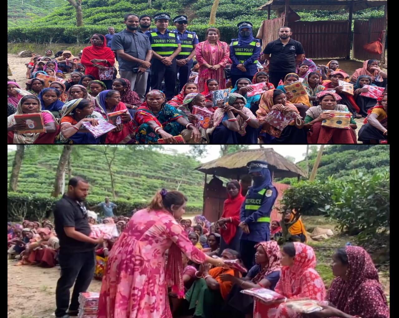 শারদীয় দূর্গাপূজা উপলক্ষে মৌলবি বাজার জেলার শ্রীমঙ্গল থানায় হিন্দু সম্প্রদায়ের চা বাগান শ্রমিকদের মাঝে বিসমিল্লাহ্ এন এম জুলফিকার ফাউন্ডেশনের মাধ্যমে শাড়ি কাপড় বিতরণ করা হয়। ১৮ সেপ্টেম্বর বৃহস্পতিবার বিকাল ৩ টার সময় শ্রীমঙ্গল থানায় মাইজদিহি চা বাগান শ্রমিকদের মাঝে এ শাড়ি কাপর বিতরণ করা হয়। ফাউন্ডেশনের চেয়ারম্যান শিক্ষানবিশ আইনজীবী নাদিরা আক্তার নিরা এর সভাপতিত্বে ও ফাউন্ডেশনের ভাইস চেয়ারম্যান মোক্তার হোসেন এর সঞ্চালনায় এ-সময়ে প্রধান অতিথি হিসেবে উপস্থিত ছিলেন, শ্রীমঙ্গল থানার অফিসার্স ইনচার্জ ট্যুরিস্ট পুলিশ মোঃ কামরুল হাসান চৌধুরী। বিসমিল্লাহ্ এন এম জুলফিকার ফাউন্ডেশনের চেয়ারম্যান নাদিরা আক্তার বলেন, কিছুদিন পূর্বে পারিবারিক ভাবে আমরা এখানে ঘুরতে এসে ছিলাম। এখানে এসে অসহায় নারী চা-শ্রমিকদের সাথে কথা বলে জানাযায় পূজা উপলক্ষে তাদের কেউ সহযোগিতা করেনা। তাদের কথা শুনে আমি তাদের প্রতিশ্রুতি দিয়েছিলাম যে তাদের পূজা উপলক্ষে নতুন কাপড় উপহার দেবো। তাই তাদের দেওয়া প্রতিশ্রুতি হিসেবে আজ শাড়ি কাপড় নিয়ে তাদের কাছে ছুটে এসেছি। আজ তাদের মুখের হাসি দেখে আমি খুব আনন্দিত। আমাদের জন্য সবাই দোয়া করবেন আমাদের ফাউন্ডেশনের মাধ্যমে সমাজের ভালো কাজগুলো এভাবে যেন করতে পারি।