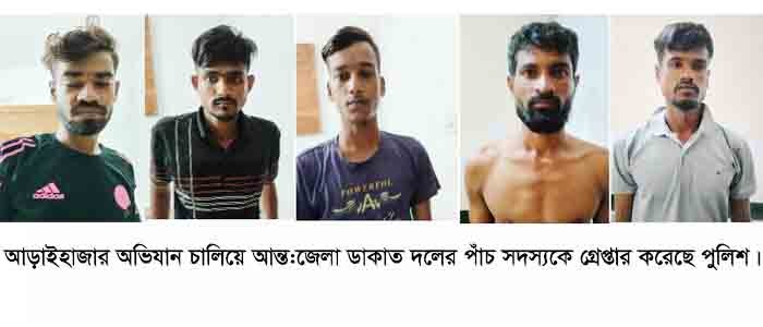 নারায়ণগঞ্জের আড়াইহাজারে বৃহস্পতিবার গভীর রাত পর্যন্ত বিভিন্ন স্থানে অভিযান চালিয়ে অভিযান চালিয়ে আন্ত:জেলা ডাকাত দলের পাঁচ সদস্যকে পুলিশ গ্রেপ্তার করেছে। আটককৃতরা হলো উজান গোবিন্দীর রিফাত মিয়া (২২), রবিন মিয়া (২৬), আব্দুল মান্নান (৩৫), ভাড়াটিয়া সুমন মিয়া (২৫) ও বড় বিনাইরচর গ্রামের ফাহিম মিয়া (২৪)। পুলিশ জানায়,
